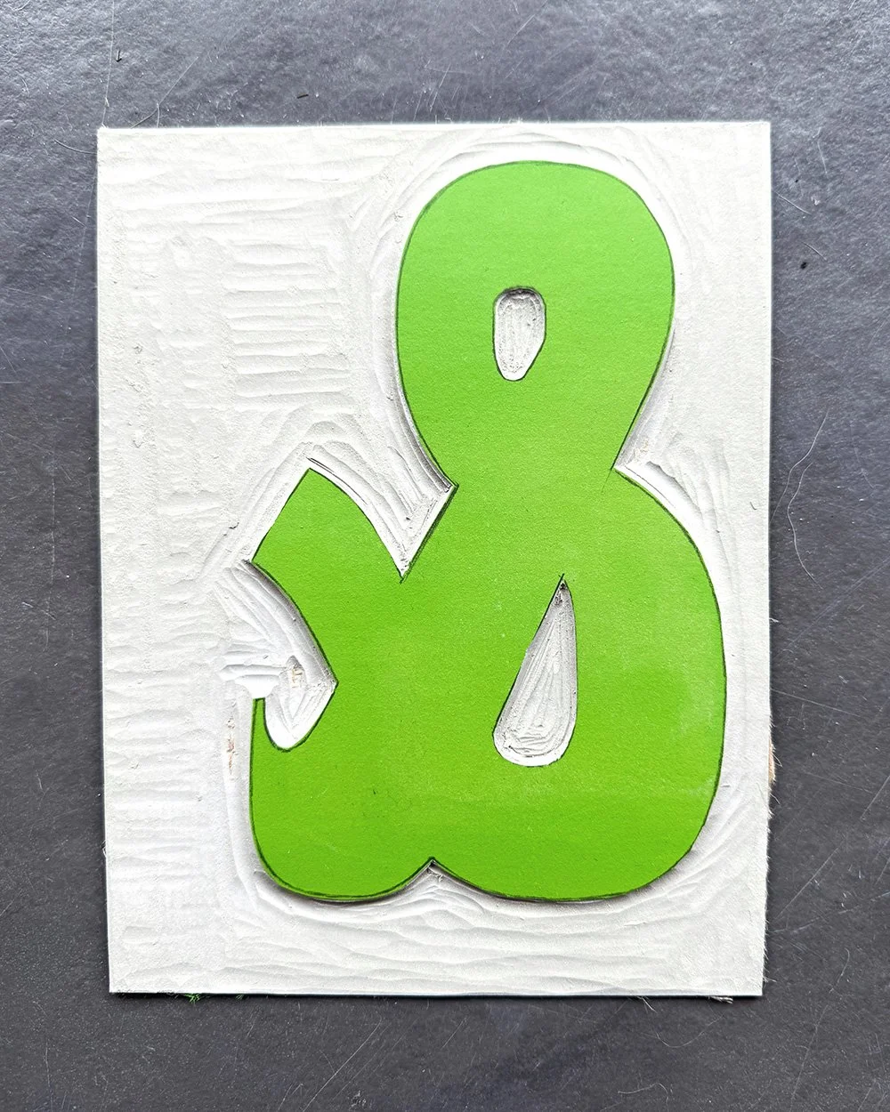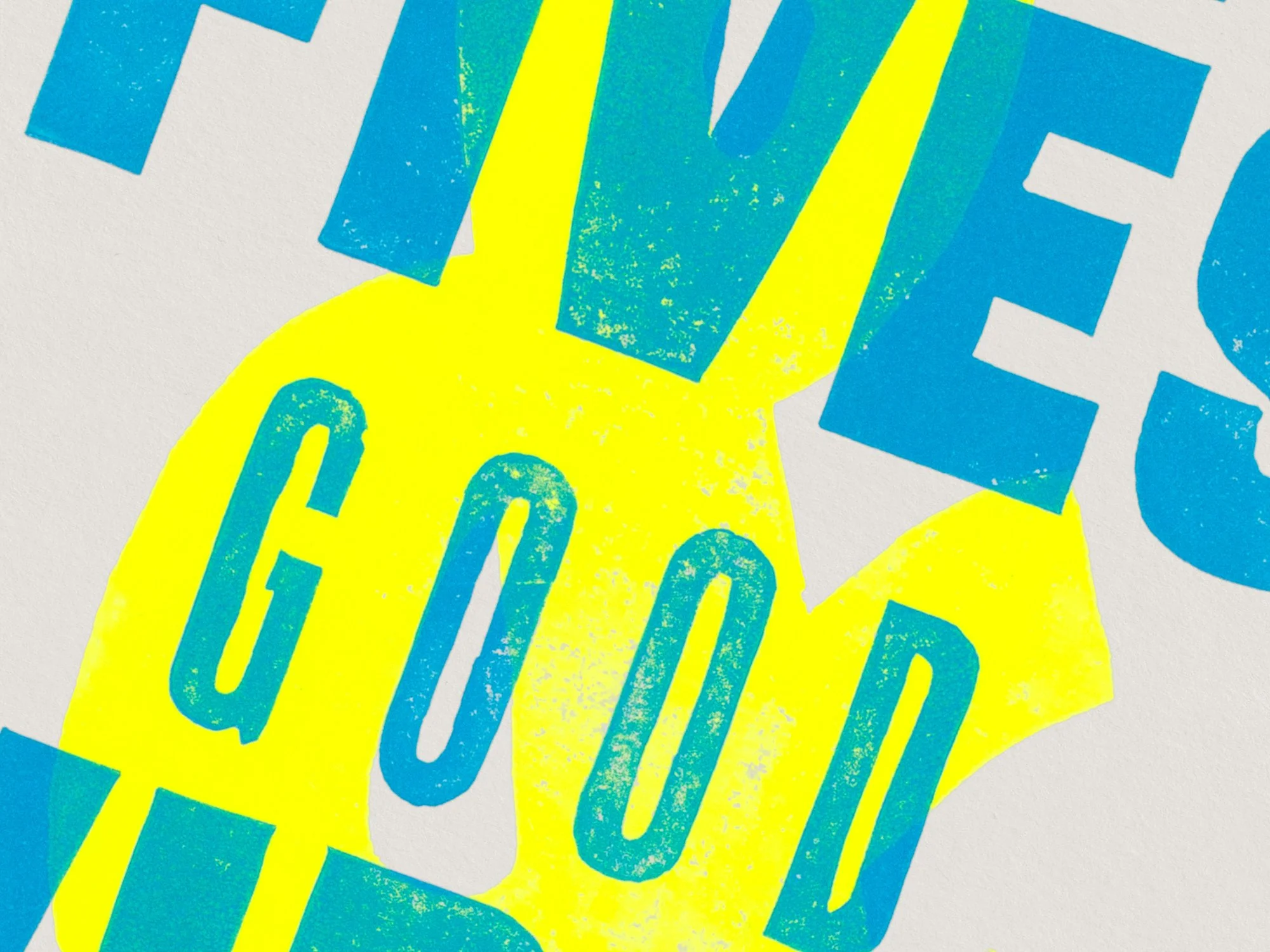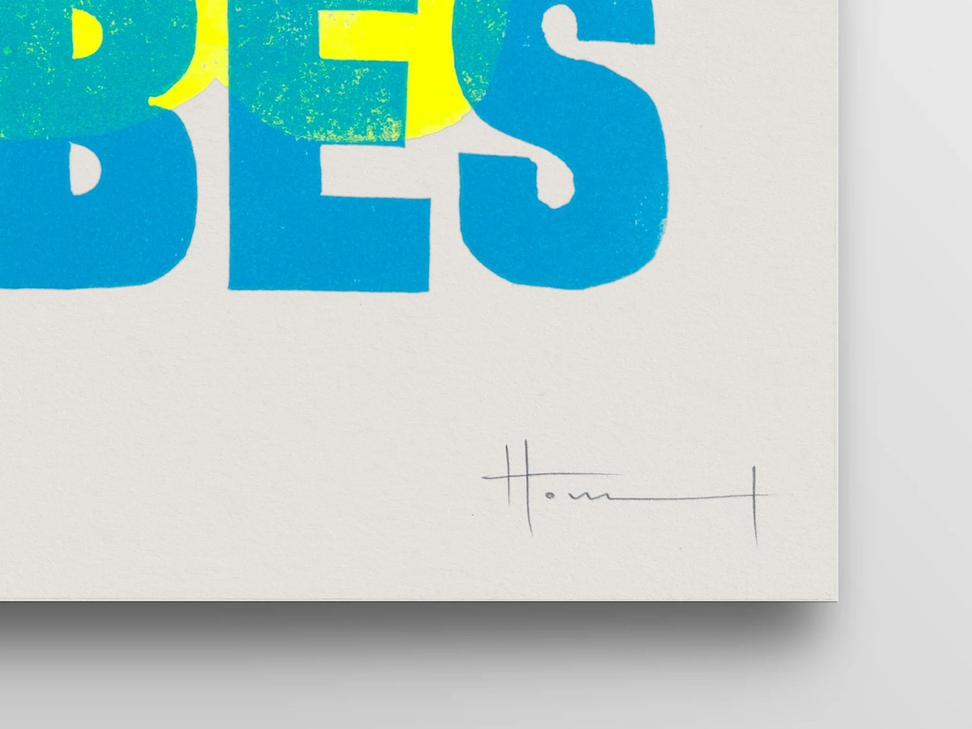 Hand-carved and printed linocut using fluorescent yellow and blue ink on Kent 190gsm off-white paper.